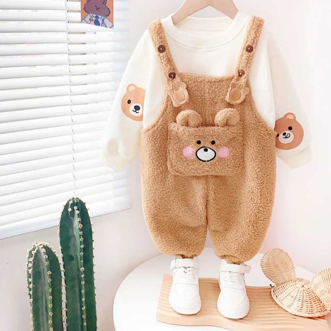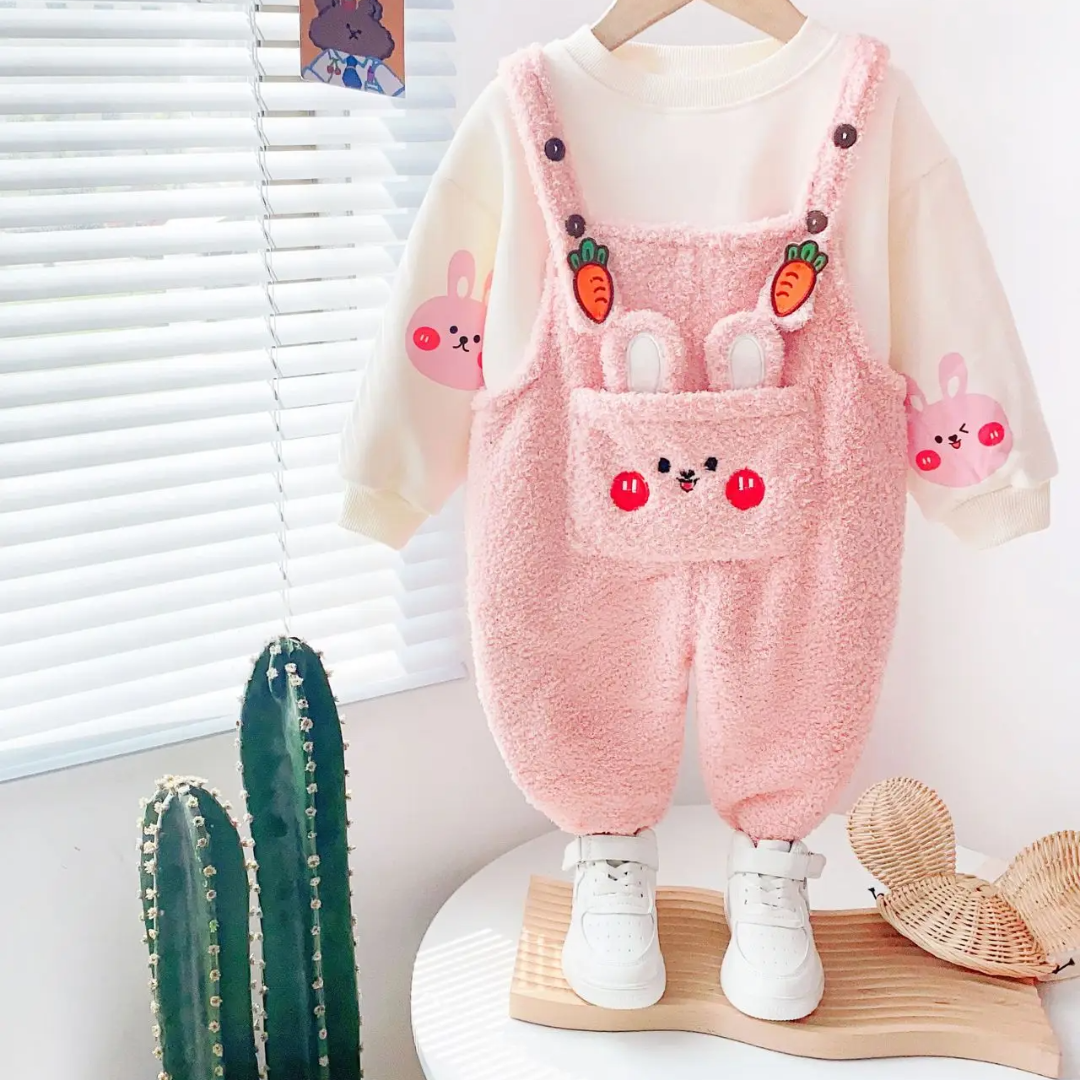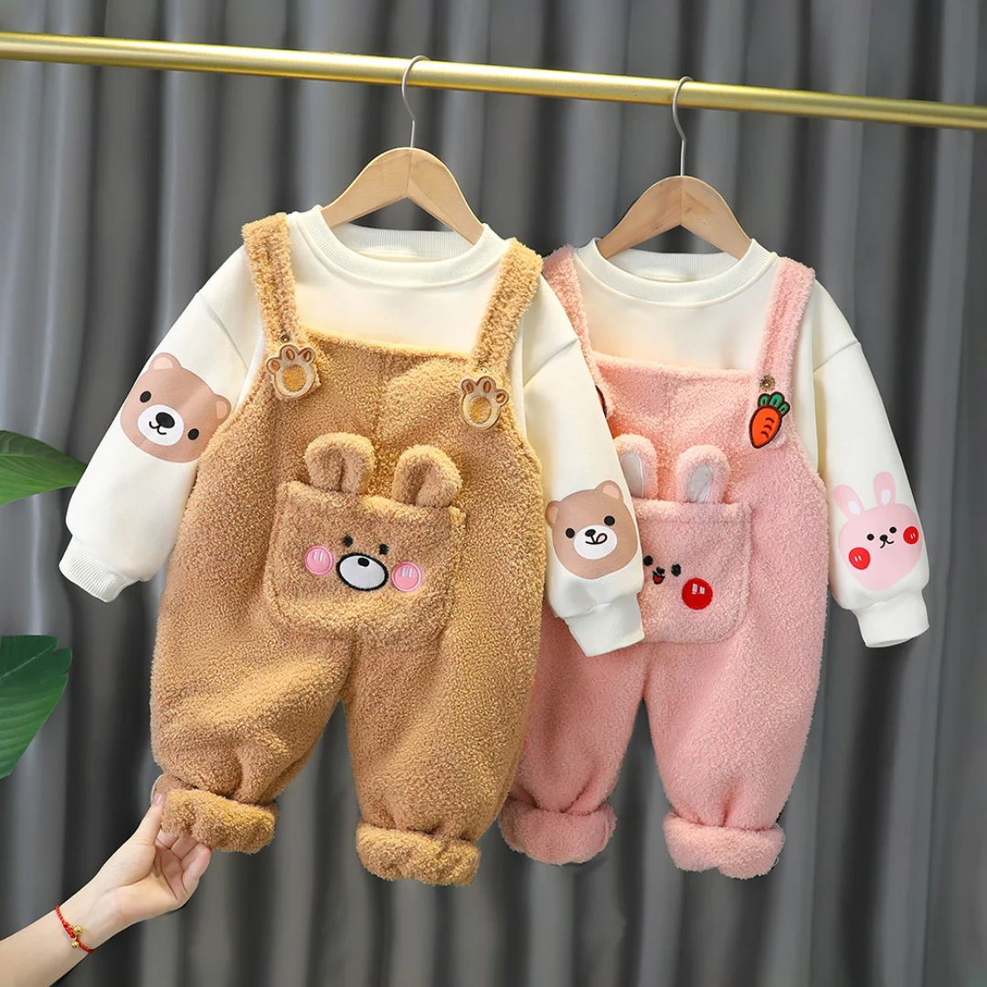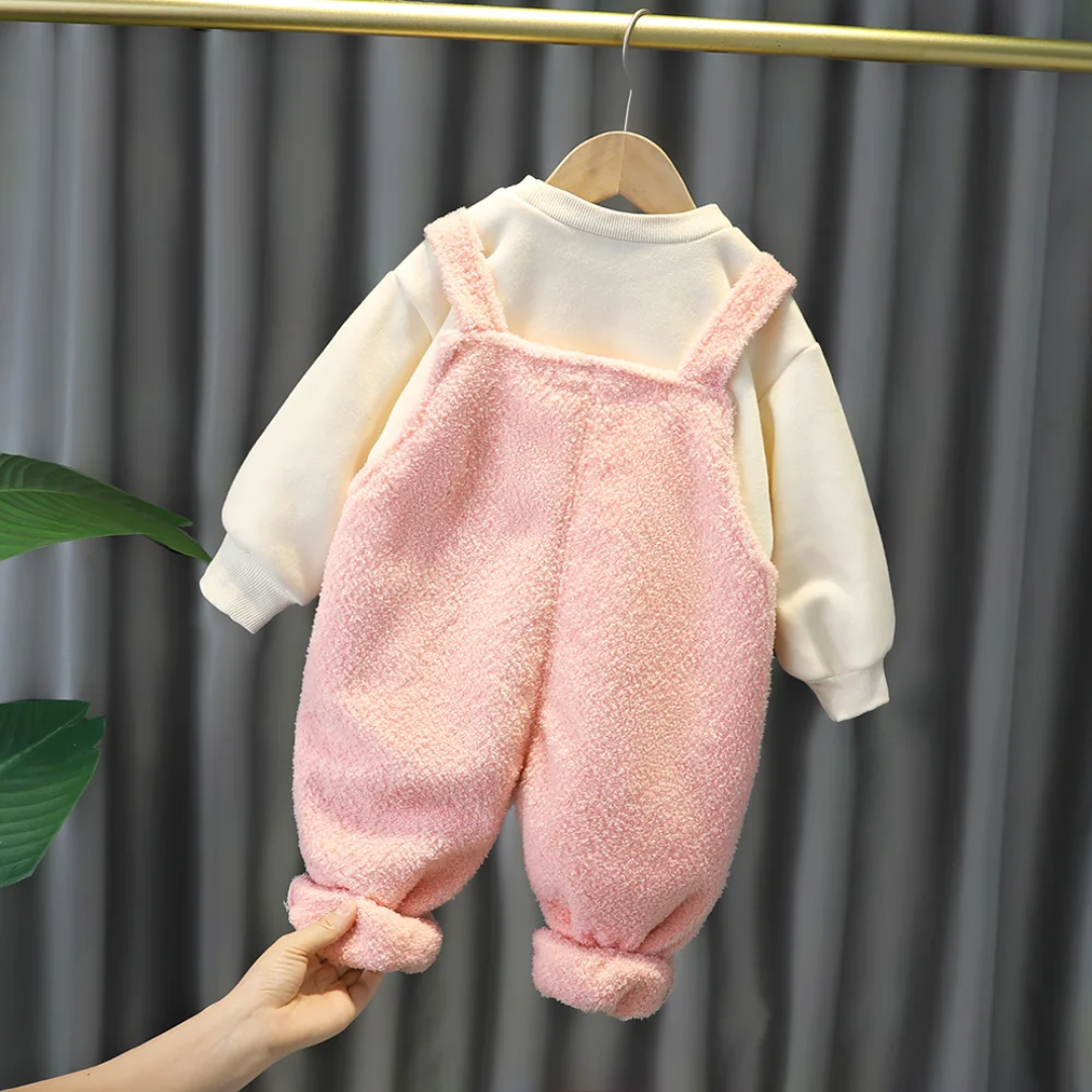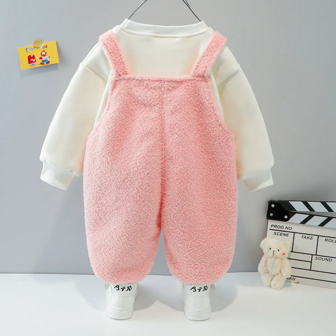 Sweet O-neck Long Sleeves Cute Girls Boutique Outfits Winter Baby Girl Clothing Set 2pcs Plush Wool Lamb Pocket Suspender Pants